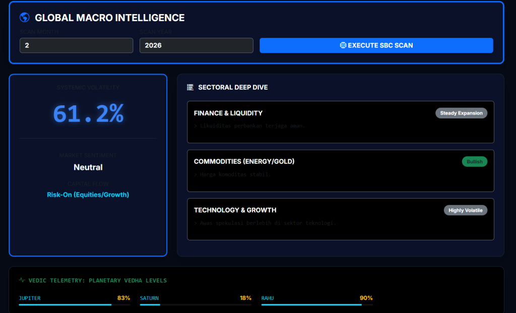 Finance & Liquidity (Steady Expansion): Aman. Dengan Jupiter 83% dan Saturnus yang lemah, bank tidak menahan uang. Kredit mengalir, likuiditas terjaga. Cocok untuk investasi jangka menengah.